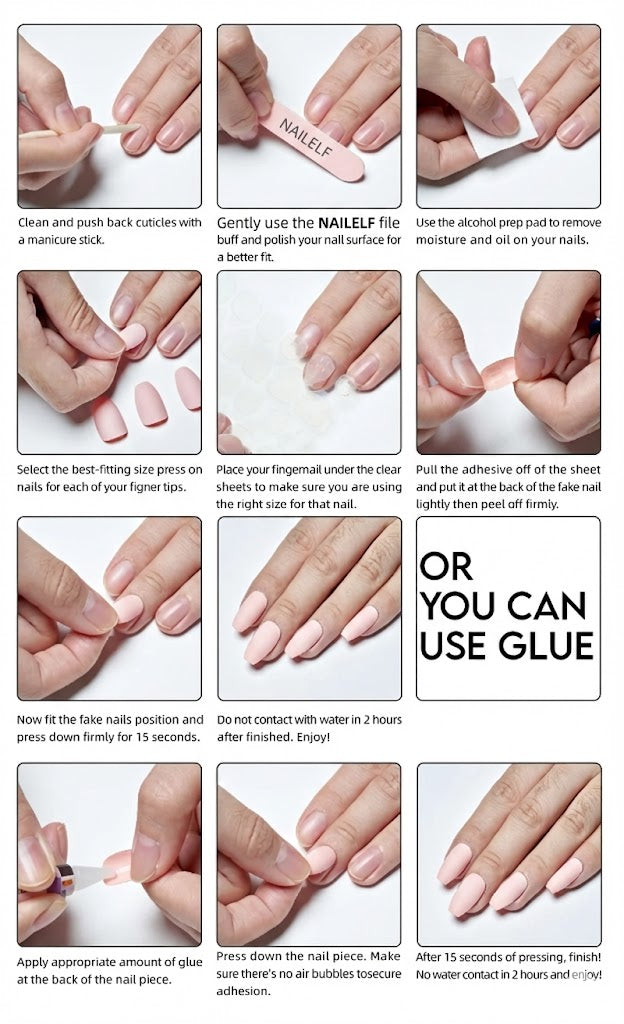 - Step3: Paste the adhesive to the inside of the nail piece, remove the protective film.